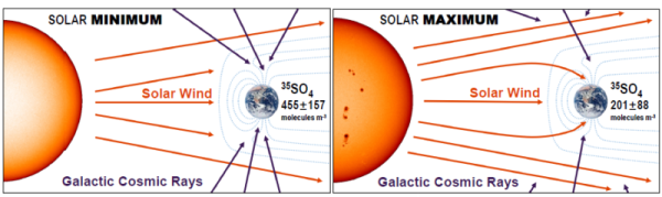 太阳活动影响地球大气放射性硫同位素浓度的示意图。太阳活动强烈(太阳黑子增多)时,太阳风较强,进入太阳系的银河系宇宙射线强度变弱,因此宇生核素产率变小。