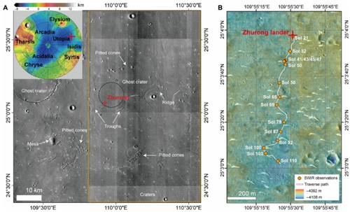 图1.(A)“祝融号”着陆点地貌图。(B)“祝融号”巡视路线图。