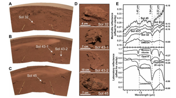图2.导航相机全景图(A)sol 32、(B)sol 43和(C)sol 45。白色箭头指示短波红外光谱观测目标岩石的位置。(D)光谱测量岩石的放大图像。(E)短波红外光谱与实验室光谱的比较。上图显示平滑的短波红外光谱(粗实线)叠加在原始光谱(细实线)。