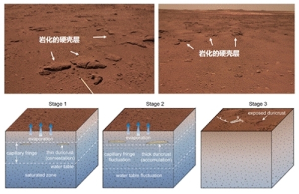 研究团队认为,上述亮色岩石与海盗一号火星着陆器原位观察到的破碎岩石在形貌上相似,是一层本地发育的硬壳(duricrust)。但海盗一号着陆区的硬壳层相对脆薄,可能是由大气中的水汽长期和火星表面土壤相互作用胶结形成。祝融号着陆点的硬壳可能更耐侵蚀,并在周围松散的土壤中形成厚层(图3),这需要大量的液态水,仅靠大气中的水蒸气无法形成。研究还发现,着陆区不存在地表径流或河道留下的明显痕迹,并且巡视路线周围未发现由水体蒸发形成的蓬松松脆的表面和盐霜残留物,从而排除了表面大规模水体活动的可能。研究团队提出一种形成机制是,沉积期前的土壤风化层在富含盐类的地下水上升或渗透期间经历了胶结和岩化作用,形成了观察到的板状岩石。盐类胶结物从毛细孔隙或靠近潜水面的地下水中沉淀,发生活跃的蒸发和聚集。地下水位的间歇性波动可能使硬壳进一步增厚,并形成层状结构。随后,覆盖在硬壳上的表土受到侵蚀作用流失,导致抗侵蚀的硬壳层暴露出来(图3)。
