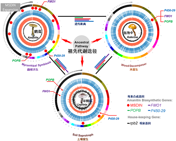 研究首次证实,在蘑菇目中,虽然鹅膏、盔孢伞、环柄菇间的亲缘关系较远,但其产生鹅膏环肽毒素的遗传学基础是一致的,均由相似的基因控制。然而,在进化长河中,上述三大类蘑菇中的毒素合成能力却发生了变化。在木腐生的盔孢伞属真菌中,仅有1个毒素前体基因且该基因编码α-鹅膏毒肽;在土壤腐生的环柄菇属真菌中,存在MSDIN前体基因家族的轻微扩张,有约10种毒素前体基因;在菌根共生的鹅膏属真菌中,MSDIN前体基因家族存在显著扩张,甚至产生了新的毒素修饰基因,可将环肽数目再扩大数十倍,因此鹅膏的实际产毒能力是盔孢伞和环柄菇的成千上万倍。