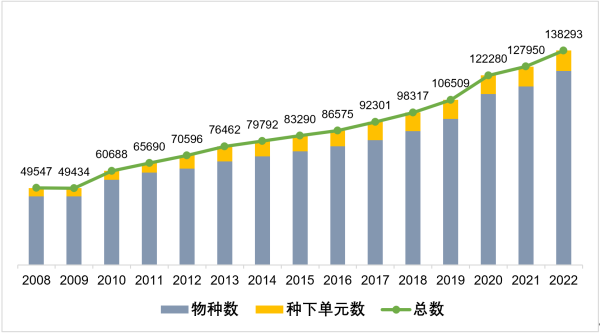 《中国生物物种名录》2022版名录共收录物种及种下单元138293个,其中物种125034个,种下单元13259个,用户可在网站下载名录。