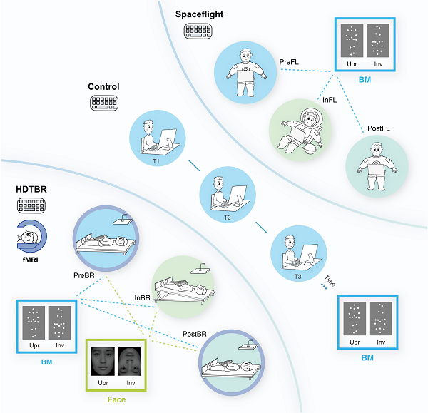 为验证航天实验的发现,并探究失重带来的生物运动知觉变化背后的神经机制,研究开展了一个在地模拟失重实验。实验采用-6°头低位卧床方法模拟航天对人的影响,该方法被证明可以诱发类似于失重状态下的生理及前庭响应改变。45天头低位卧床实验产生了和航天实验类似的行为影响,即生物运动知觉倒置效应在头低位卧床期间逐渐减弱,并最终降至显著低于前测的水平。同时,研究还测量了面孔知觉倒置效应,发现其并不随头低位卧床时间增长而减弱,说明生物运动知觉的改变可能源于运动而非形状信息加工受前庭响应改变的影响。