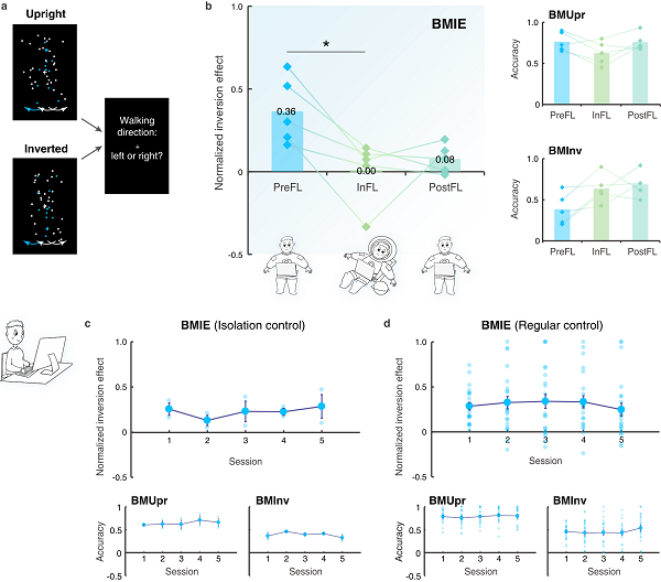 该研究成果支持了后一种假设。通过航天实验,研究发现暴露于太空失重环境约一周之后,航天员生物运动知觉的倒置效应显著降低,且该效应在个体间具有高度的一致性(图2a、b),提示地球重力环境对于维持人类对生物运动信息的朝向特异敏感性至关重要。为了进一步检验上述效应是由失重还是其他非重力因素(如航天实验环境和练习效应)引起,研究开展了两个控制实验。结果发现,在正常地球重力条件下,不论个体是在模拟航天任务的幽闭环境中反复进行生物运动知觉测试,还是在实验室中进行多次测试,均不会表现出生物运动知觉倒置效应的减弱(图2c、d),从而支持太空失重、而非重力无关因素决定了航天实验的结果。