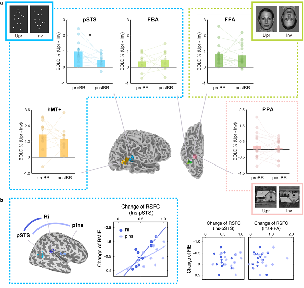 在头低位卧床模拟失重前后,研究还利用功能磁共振成像技术扫描了受试者的神经活动。在前测中,大脑中特异于生物运动加工的pSTS脑区表现出对生物运动刺激的朝向依赖性响应(神经水平的倒置效应),而该效应在后测中显著下降,且上述改变无法由简单运动或静态身体形状刺激诱发的神经响应所解释(图3a)。作为对照,负责面孔加工的FFA脑区在前测中表现出对面孔刺激的朝向依赖性响应,但该效应在后测中并未发生改变;此外,加工房屋刺激的PPA脑区对正倒立房屋刺激的相对响应强度也未在前后测中表现出差异。这些结果排除了头低位卧床本身改变一般性静态物体表征的可能性,说明模拟失重特异性地改变了生物运动信息的朝向特异性视觉加工。静息态功能连接分析进一步发现,pSTS与脑岛后部区域的功能连接在后测显著增强;该连接增强幅度可预测行为水平生物运动知觉倒置效应的减少幅度(图3b)。后脑岛作为前庭系统的核心脑区,已被发现与前庭和视觉重力信息加工及内部重力模型的存储有关,因而上述结果有力支持了前庭重力计算参与视觉生物运动信息朝向特异性加工的假说。