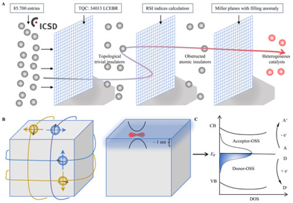 研究团队从无机晶体数据库中的3万余种非拓扑材料出发(arXiv:2111.02433),计算了这些材料的实空间不变量(Real-space invariants),发现存在着这样一类材料,即obstructed Wannier电荷中心(OWCCs)与晶体的原子位置不重合时,会出现一种内禀的金属表面电子态(OSSs)。分析发现,这些金属电子态完美满足了催化材料活性位点的基本要求:当解离出该晶面时,会有表面态产生;具有良好的导电性;电子态位于费米面附近,易参与电子转移与成键。