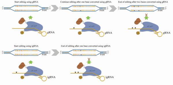 近日,中国科学院天津工业生物技术研究所研究员毕昌昊团队和研究员张学礼团队在精准实现单碱基编辑方面取得重要进展。研究人员通过分析CBE生成的各类编辑产物的实际分布情况,发现CBE强烈倾向于一起编辑多个胞嘧啶碱基。借鉴以往的研究经验,他们推测对gRNA进行修饰可能会改变其碱基编辑性能。因此,研究人员设计了一种不完美的gRNA (imperfect gRNA,igRNA) 编辑方法:利用具有一个或多个与目标基因座不匹配的碱基的gRNA来指导碱基编辑。结果表明,与普通gRNA编辑相比,使用CBE和ABE进行igRNA编辑大大增加了单碱基编辑比例,并提高了编辑效率,尤其在DNMT3B、NSD1、PSMB2、VIATA hs267和ANO5等位点,实现了近乎完美的单碱基编辑。同时,研究人员发现将igRNA与无PAM编辑器(例如SpRY-ABEmax)相结合,可以在某些基因组位点实现任何位置的可控单碱基编辑。此外,研究人员还探讨了igRNA在构建SNPs相关细胞系方面的研究,并进行了概念验证。