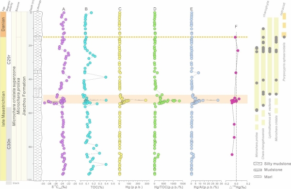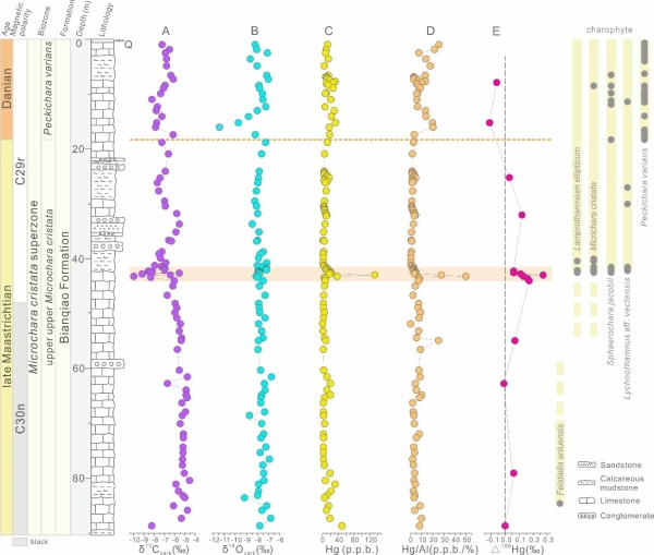 为了探明德干火山活动对湖泊环境和生物群的影响,研究团队开展了碳同位素和古生物学研究。胶莱盆地有机碳同位素和平邑盆地无机碳同位素同时发生强烈负偏,表明徳干大火成岩省的主要脉冲对汞和全球碳循环有巨大影响。两个湖泊生物群对变暖事件有明显响应,胶莱盆地和平邑盆地的轮藻、介形类成种作用明显,生物多样性升高。而在海洋中,浮游有孔虫属种则发生部分灭绝、侏儒化、灾难物种盛行的现象,说明马斯特里赫特期末期变暖事件以不同机制同时影响了海洋和陆地的生态系统。