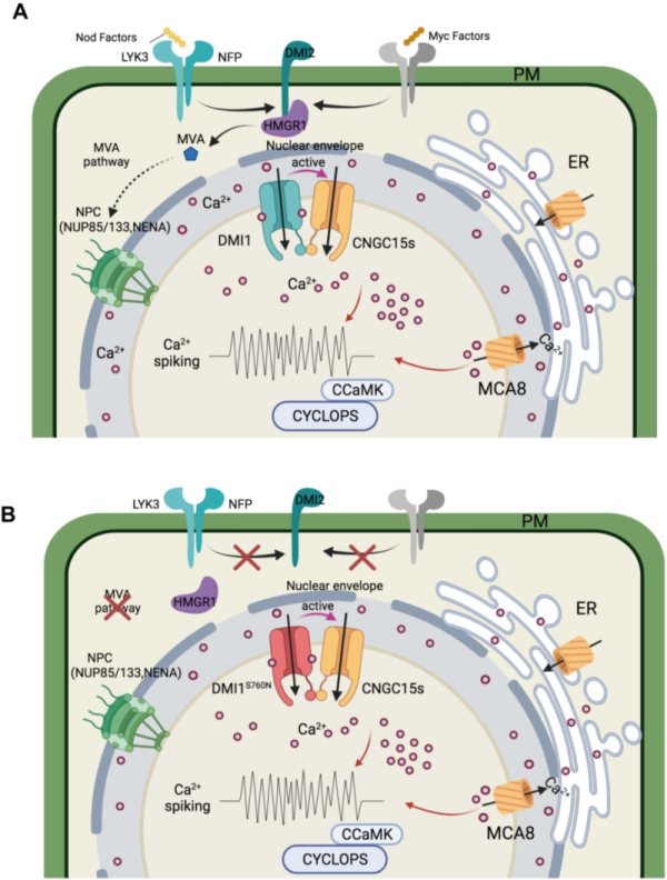 在豆科植物与根瘤菌共生固氮体系中,根瘤作为豆科植物特化的、重要的共生固氮器官,受NF信号途径激活而形成;而细胞核钙振荡作为NF信号的早期响应调控着下游共生基因的表达(Ehrhard et al., 1996)。在蒺藜苜蓿(M. truncatula)中,DMI1与CNGC15是两个定位于核膜的钙离子通道蛋白,参与核及核周钙振荡的形成,且DMI1还可以与CNGC15相互作用(Charpentier et al., 2016)。然而,共生过程中核钙信号的编码以及DMI1与CNGC15如何调控核钙信号形成的机制尚不清楚。