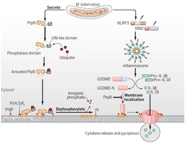 炎症小体(inflammasome)是近年来在哺乳动物免疫细胞中发现的一种多聚蛋白复合物,主要由胞质中的模式识别受体(如NLRP3和AIM2等)、凋亡相关斑点样蛋白(ASC)及caspase-1前体蛋白(pro-caspase-1)组成。当受到活化信号刺激时,炎症小体能够迅速组装并使pro-caspase-1发生自剪切产生具有酶活性的caspase-1,后者进一步剪切下游的关键效应分子gasdermin D(GSDMD)及炎性细胞因子前体pro-IL-1β和pro-IL-18,剪切后的GSDMD的N-末端效应结构域(GSDMD-N)随后在质膜内侧聚集并产生孔洞,进而介导成熟的炎性细胞因子(IL-1β和IL-18)的释放及细胞焦亡(pyroptosis)的发生。已有研究发现,炎症小体-细胞焦亡通路在宿主抵抗Mtb等病原体感染过程中发挥重要作用。然而,这些病原体是否能够以及如何逃逸该免疫机制尚不清楚。因此,进一步鉴定Mtb等病原体调控宿主炎症小体-细胞焦亡通路的关键效应蛋白并阐明其作用机理,有望为TB等感染性疾病提供新的药物靶标与干预策略。