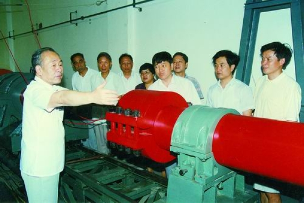 1998年9月,俞鸿儒(左一)为JF-10爆轰驱动激波风洞代表现场讲解JF-10的运行原理。