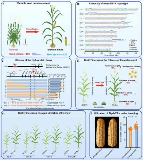 为了充分利用野生玉米的基因资源,挖掘控制野生玉米高蛋白的优良变异基因,研究团队破解了高度复杂的野生玉米基因组。研究采用三代测序技术和三维基因组相结合的策略,摸索并拼装出既杂合又复杂的野生玉米单倍体基因组(Zea mays ssp. parviglumis, accession number Ames21814),用于野生玉米高蛋白基因的定位和克隆。科研人员经过艰苦攻关,连续创制了超过10代的遗传材料,构建出野生玉米和普通玉米自交系B73的高世代近等基因系群体。在这一过程中,研究提取了超过4万个样本的DNA进行基因型鉴定,测定了超过2万个样本的蛋白含量进行表型分析,并分别在回交群体的第4代BC4(n=500)、第6代BC6(n=1314)以及第8代BC8(n=1344)进行了3次大规模高蛋白遗传群体的测序以及精细的图位克隆,最终在野生玉米中克隆到首个控制玉米高蛋白含量的主效基因THP9。该基因编码天冬酰胺合成酶4 (ASN4),ASN是氮代谢的中心,负责合成天冬酰胺。天冬酰胺在氮循环中具有核心作用,并在氨基基团的分子间转移反应中充当氮供体。因此,植物中的天冬酰胺水平与种子蛋白质含量密切相关。研究发现,野生玉米优良基因Thp9-T显著高表达,而B73和一些玉米自交系中含有Thp9的突变形式Thp9-B,导致ASN4的表达量较低。野生玉米优良基因Thp9-T导入玉米自交系B73后,使种子蛋白质含量增加约35%,根中氮含量增加约54%,茎中氮含量增加约94%,叶片中氮含量增加约18%,且生物量即植株整体重量增加。