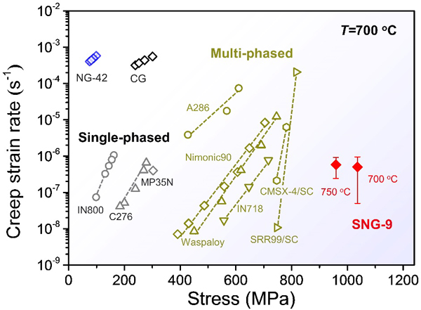 金属材料在高温下长期承受低于屈服强度的应力作用时会发生永久形变,通常称为蠕变。蠕变会导致高温金属构件的变形失效,是高温合金的重要性能指标。合金化和减少晶界(制备单晶)可提升高温合金抗蠕变性能,但这带来合金制备工艺复杂、成本高等问题。进一步提升高温合金的抗蠕变性能面临挑战。