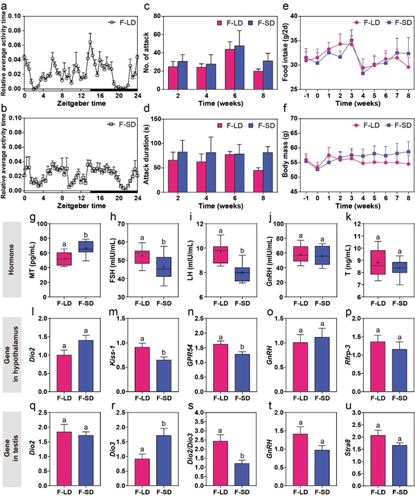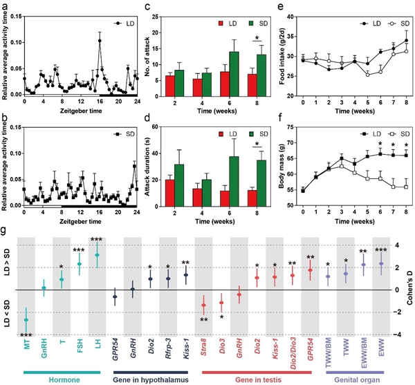 图1.长或短光周期处理下,布氏田鼠生长发育、行为和繁殖指标的变化