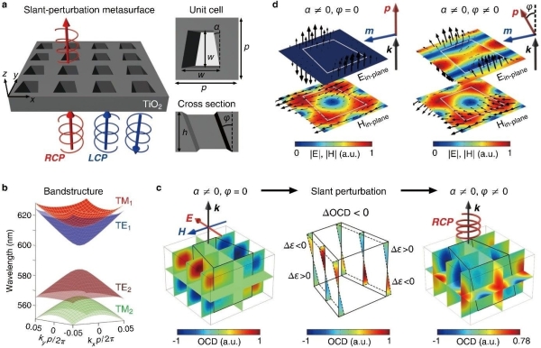 图1.(a)倾斜扰动超表面产生chiral BIC的示意图。(b)超表面的能带结构。(c)截面上OCD的分布。左:α≠0,φ=0,右:α≠0,φ≠0,中:倾斜微扰区域的OCD分布。(d)无倾斜(左)和有倾斜(右)引入情况下,电场和磁场在中心x-y面上的分布,以及相应的电偶极子p和磁偶极子m结构。