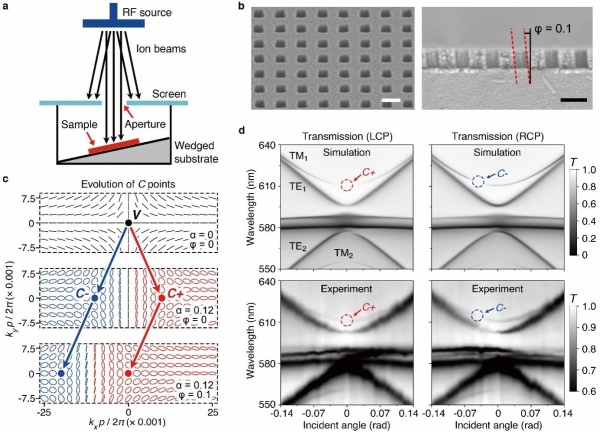 图2.(a)倾斜RIE刻蚀装置示意图。(b)超表面样品的侧视图和截面图,比例尺:300 nm。(c)C点在动量空间随面内和面外扰动引入的演化图。(d)左圆偏光和右圆偏光入射时,超表面的角分辨透射谱(上:仿真结果,下:实验结果)。