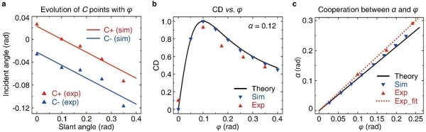 图3.(a)超表面具有不同倾斜角时C+和C-点对应的圆偏光入射角度。(b)当α固定时,CD值与φ之间的关系。(c)最大化CD值需要满足的α和φ之间的关系。