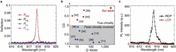 图4.(a)实验测得超表面样品的圆偏振基反射谱。(b)本工作得到的CD与Q值与现有其它工作的对比,这些工作根据CD信号的来源分为两类。(c)旋涂染料分子的超表面在光泵浦下的偏振分辨荧光发射谱。