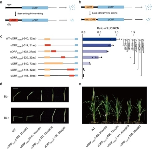 通过编辑uORF培育具有目标性状的水稻植株。(a、b)从头创制新的uORFs(a)或延伸内源uORFs(b)抑制目标基因的蛋白表达;(c)通过产生一系列具有不同抑制能力的uORFs梯度下调基因的表达;(d、e)含有uORFs变体的突变体对油菜素内酯的敏感性(d)和植株表型(e)。