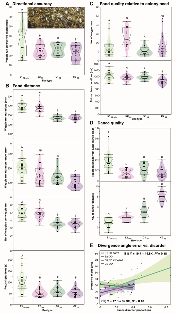 图3. 实验蜂群(E1为9日龄的幼蜂,E2为30日龄的成蜂)和自然蜂群(C1为9日龄的幼蜂,C2为30日龄的成蜂)舞蹈表示方向的精准度A、蜜源的距离B、舞蹈的质量D和舞蹈混乱比率E等指标的结果