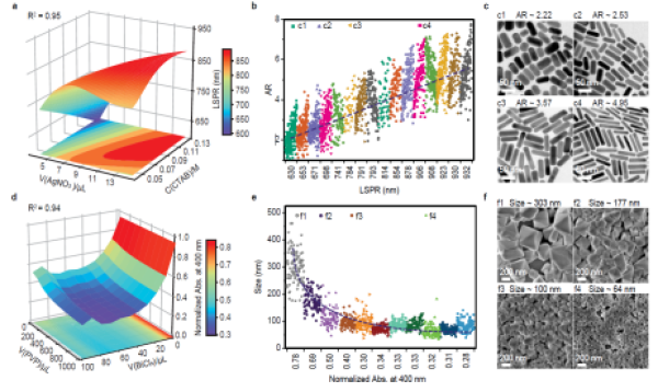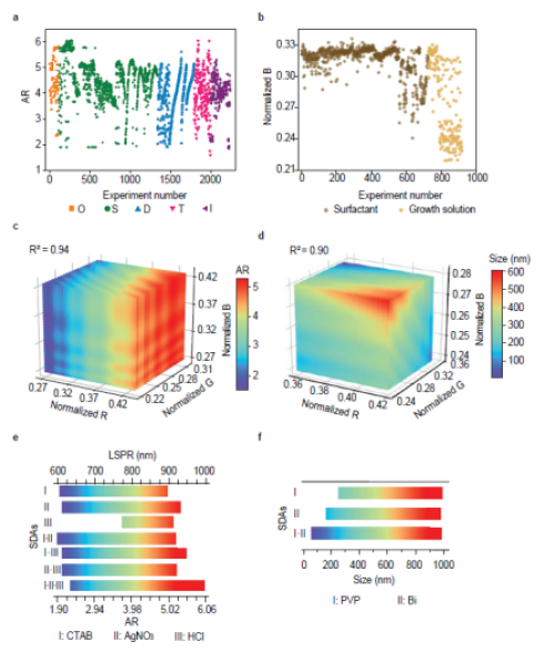 为了实现自动化合成,研究人员对文献进行数据挖掘,以提供关键合成参数的初始选择。针对金纳米棒,对1300篇已报道的金纳米棒合成的相关文献进行数据挖掘,并对其关键参数进行分水平排序,从而获取机器人执行参数,并设计正交实验及高通量实验验证,获取了金纳米棒形貌调控的重要参数。针对双钙钛矿,通过对其他钙钛矿相关文献进行数据挖掘,筛选出潜在的可供调节双钙钛矿尺寸形貌的48种溶剂和61种表面活性剂,结合高通量原位合成和表征,快速实现了溶剂和表面活性剂的筛选。
