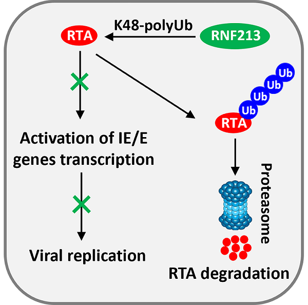 综上,该工作首次鉴定了干扰素诱导基因RNF213抑制γ疱疹病毒复制的功能,揭示了RNF213与病毒“分子开关”蛋白RTA互作并介导RTA泛素化修饰和降解的分子机制。该成果有助于探究天然免疫尤其是干扰素如何调控γ疱疹病毒潜伏感染和裂解复制,为有效防控病毒感染提供了新思路。