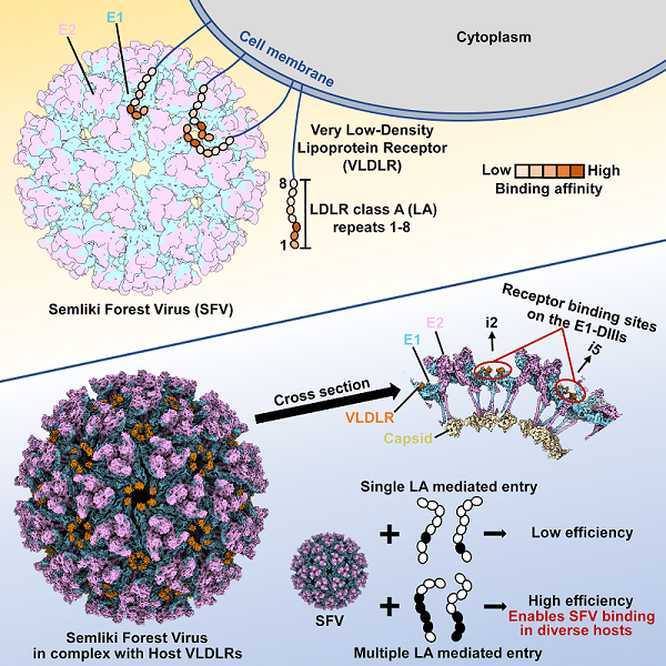 甲病毒(alphavirus)是一类由蚊虫等节肢动物传播的、有囊膜、单链、正义RNA病毒,属于披膜病毒科(Togaviridae),能广泛感染人、鸟、鼠、马等多种动物并引起相关疾病。甲病毒感染人类后可引起发烧、严重且持续的头痛、肌肉疼痛和关节痛。一些甲病毒能感染神经细胞并导致中枢神经系统感染,引发重症脑炎。迄今为止,尚无任何药物或者疫苗被批准用来治疗或者预防甲病毒的感染。近年来,关于甲病毒侵染机制的研究已有系列重要进展。基孔肯雅热病毒(CHIKV)与其受体Mxra8(matrix remodeling associated protein 8)结合的分子机制和委内瑞拉马脑炎病毒(VEEV)与其受体LDLRAD3(Low-density lipoprotein receptor class A domain-containing protein 3)结合的分子机制均已清晰阐明。然而,根据现有研究尚不能解释甲病毒能广泛感染从非脊椎动物到脊椎动物、且进化关系上跨度很大的多种物种的原因。2021年有研究报道表明载脂蛋白受体VLDLR(very-low-density lipoprotein receptor)是多种甲病毒,包括塞姆利基森林病毒(Semliki Forest Virus, SFV),感染蚊虫、鼠、马、人等多个物种的通用受体。介导病毒跨越差异较大的不同物种之间传播的通用受体鲜有报道,病毒与这类受体的结合模式及其介导的跨物种传播机制尚不清楚。