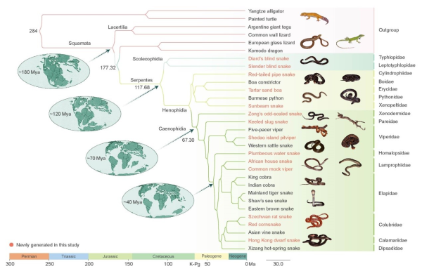 该研究表明,蛇类起源于约1.18亿年前早白垩纪,与帝王蛇蜥和科摩多巨蜥组成的支系互为姐妹枝,这提示蛇类的祖先起源于蜥蜴类物种。蛇类最先分化出的类群为盲蛇类物种(Typhlopidae和Leptotyphlopidae),在白垩纪-早第三纪分界点(K-Pg,约6500万年前)的生物大灭绝事件之后迎来了物种的爆发。