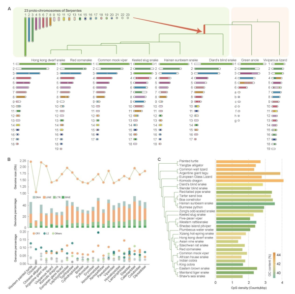 研究重构的蛇类祖先基因组由23对染色体组成,其中包含8对大染色体和15对小染色体。蛇类Z染色体可能起源于蜥蜴的常染色体且在整个蛇类演化中,至少发生过一次断裂。基因组大小与转座子含量的高低呈显著正相关关系,这与蛇类基因组大小与转座子含量无关的结论(之前基于短序列测序提示的结论)是不一致的。与鸟类、哺乳类动物相反,蛇类基因组的GC含量向着降低的方向演化,表明其基因组演化道路可能不同于其他脊椎动物类群。