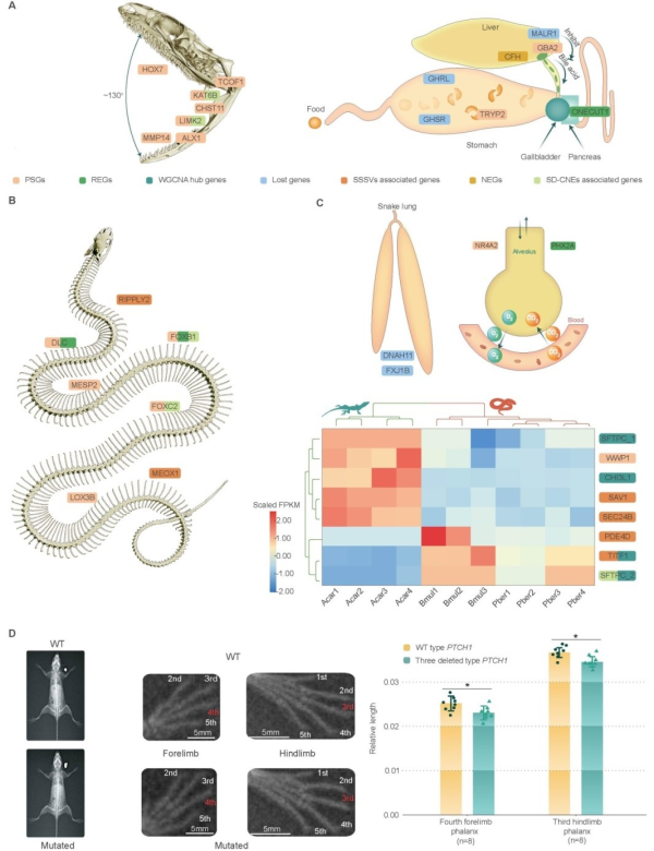 四肢缺失是蛇类最为特殊的特征。该研究揭示除ZRS增强子外,PTCH1基因编码蛋白的三个氨基酸残基缺失,可能是蛇类四肢缺失的重要遗传机制之一。随着四肢缺失,蛇类的体节数增加,身体延长。研究发现,控制脊椎前端发育(FOXC2)和后端发育(DLLC)的重要基因受到强烈正选择,提示它们可能是蛇类身体延长的重要遗传基础。蛇类为适应身体延长,部分器官不对称发育,如退化了一侧肺。研究发现,蛇类丢失了控制对称发育的DNAH11和FXJ1B基因,这可能是蛇类肺左右不对称发育的关键原因,研究成果对理解脊椎动物的器官不对称发育具有重要意义。