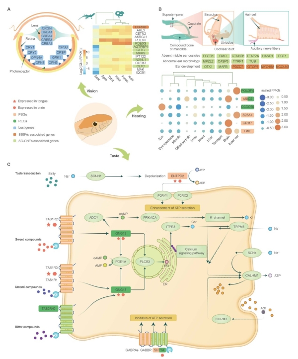 蛇类虽然不是聋子,但没有外耳、中耳,其听力范围仅为50-1000 Hz,远小于人类(10-20000Hz)和蜥蜴(<100-7700 Hz)。研究发现,16个蛇类耳发育相关基因的潜在调控元件发生了快速演化,重要耳蜗蛋白(otospiralin)编码基因在蛇类中丢失,表明它们可能是蛇类耳形态变化的遗传基础。此外,感受机械振动相关的基因(ASIC2)受到强烈正选择,且在蛇类内耳高表达,揭示它可能是蛇类对机械振动敏感的主要原因。尽管蛇类是否有味觉存在争议,该研究发现蛇类普遍拥有味觉受体及味觉传导相关信号通路,且苦味受体编码基因(TAS2R40)快速演化,提示蛇类的味觉可能并未丢失,且功能可能有一定强化。