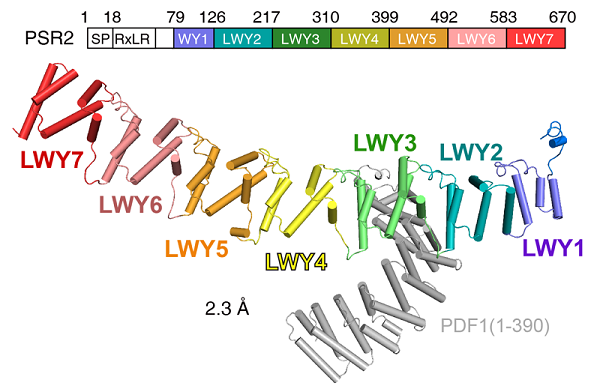 本研究揭示了在疫霉属中普遍存在一类WY1-(LWY)n效应子蛋白,通过保守的PP2A interacting module挟持宿主细胞中的PP2A核心酶,并形成一种非传统型的全酶形式,干扰宿主细胞的某些免疫防御过程,使得病原微生物更易侵染植物(图2)。疫霉的感染是全球植物健康和粮食安全的主要威胁。上述成果可为植物病原菌防御提供重要理论支持。