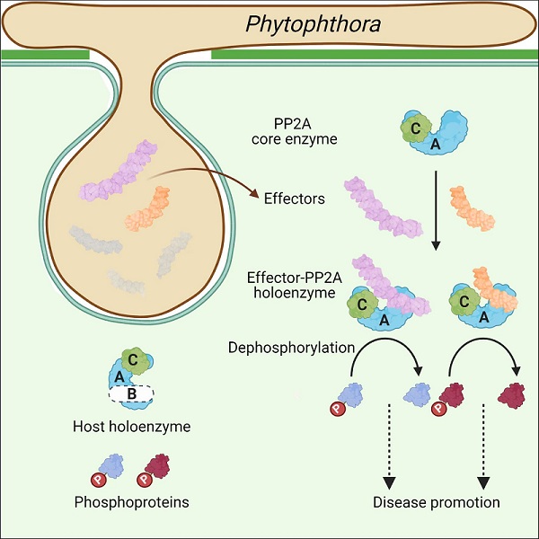 在病原微生物感染植物过程中,为了有效侵染宿主,病原微生物会向宿主细胞中分泌一大类蛋白分子即效应子(effectors)。效应子通过操纵宿主细胞的免疫相关分子,进而干扰植物细胞的免疫防御过程,从而使得病原菌更容易侵染植物。为了进一步探究效应子与特定宿主分子的相互作用,本研究以来自大豆疫霉(Phytophthora sojae)的效应子PSR2为研究对象,通过免疫共沉淀检测,发现其可以挟持宿主细胞中的PP2A核心酶,并形成一种非传统型的全酶形式。该全酶干扰了宿主细胞的某些代谢通路,使得病原微生物更易侵染植物。