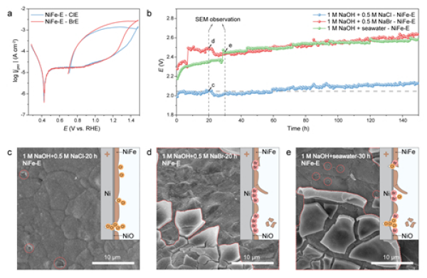 研究表明,除了抗Cl-腐蚀外,设计抗Br-腐蚀阳极对于海水电解的实际应用更为重要。相关研究成果以Concerning the stability of seawater electrolysis: a corrosion mechanism study of halide on Ni-based anode为题,发表在《自然-通讯》(Nature Communications,DOI:10.1038/s41467-023-40563-9)。