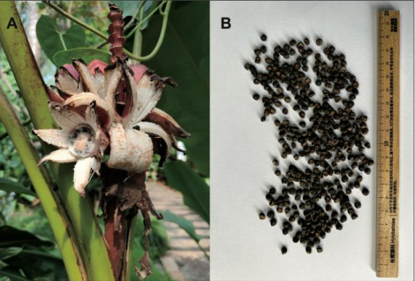 带种子的野芭蕉。左图是一种果皮颜色艳丽,成熟后自动炸裂开的野芭蕉(Musa velutina);右图是收集的该种的种子。