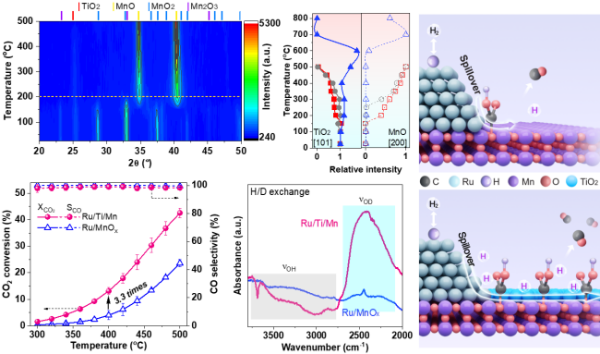 相关研究成果以Generation of Oxide Surface Patches Promoting H-spillover in Ru/(TiOx)MnO Catalysts Enables CO2 Reduction to CO为题,发表在《自然-催化》(Nature Catalysis)上。研究工作得到国家自然科学基金和辽宁省“兴辽英才计划”等的支持。