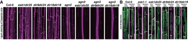 图1. 引导蛋白是凯氏带形成(A)以及凯氏带和质膜紧密连接(B)所必需的