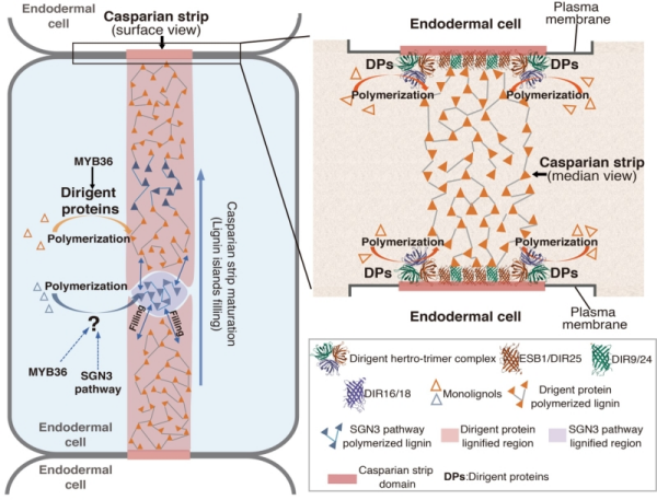 图3. Dirigent protein复合体调控凯氏带发育和木质素聚合的分子机制