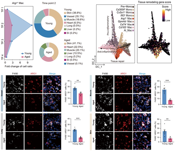 进而,该工作鉴定出一群高表达Arg1的巨噬细胞(Arg1+巨噬细胞)。这群细胞表现出组织修复相关的分子特征,并高表达与内皮细胞增殖、生长因子产生、伤口愈合和血管生成调节相关的基因。结合进一步的实验验证,研究发现,这群细胞可能通过与内皮细胞相互作用,促进血管新生。Arg1+巨噬细胞的数量在年轻组织的再生修复过程中受到精密调控,在再生修复早期显著增加,并很快恢复至损伤前水平。而在年老组织中,这群细胞的数量在稳态阶段高于年轻组织,但损伤修复过程中并未出现剧烈变化(图1)。这提示衰老组织中的再生相关免疫细胞处于一种“脱敏”的“低弹性”状态,可能阻碍了器官损伤后的及时组织重塑和修复。