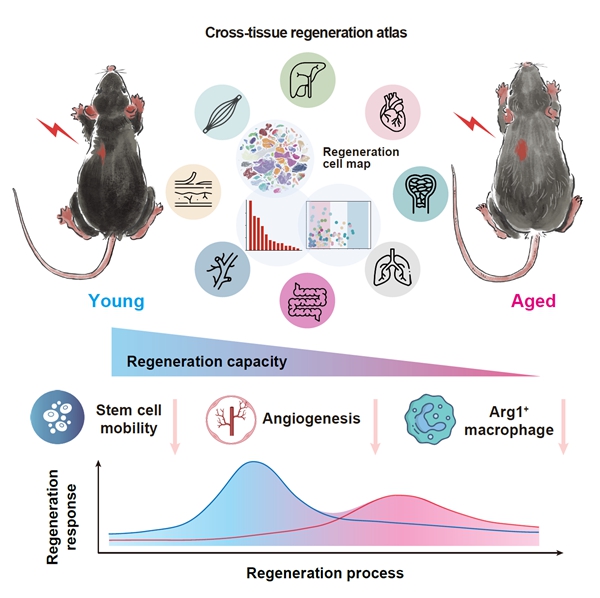 10月27日,中国科学院动物研究所刘光慧研究组、曲静研究组,联合北京基因组研究所张维绮研究组,在《细胞-干细胞》(Cell Stem Cell)上,在线发表题为Decoding aging-dependent regenerative decline across tissues at single-cell resolution的研究论文。该研究通过在年轻和年老小鼠中构建八种组织器官损伤后再生修复模型,首次在单细胞分辨率系统比较了不同组织中参与再生修复过程的分子动态变化规律,揭示了干细胞响应和血管生成能力降低是年老组织再生功能障碍的关键因素,并鉴定出年轻器官强再生能力相关的巨噬细胞新亚群。该成果有助于增加科学家对增龄伴随的再生异常及器官退行规律的认知,为发展促进组织再生、延缓衰老的干预策略提供了新的线索和思路。