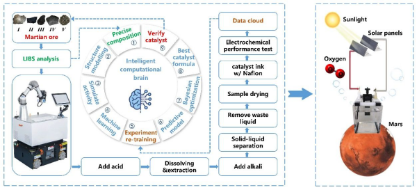 移居火星是人类的梦想,但首先要解决缺乏氧气的问题。火星上存在水资源的可能,为利用太阳能驱动的电催化析氧反应制备氧气提供了机遇。人类无法在无氧的火星环境下长期生存,因而在火星上就地取材创制催化剂成为难以逾越的屏障。近日,中国科学技术大学教授罗毅、教授江俊、副教授尚伟伟团队,与深空探测实验室研究员张哲等合作,采用中国科大“机器化学家”“小来”平台,高效融合人工智能和自动化机器实验,利用火星陨石制备出实用的产氧电催化剂。相关研究成果以Automated synthesis of oxygen-producing catalysts from Martian meteorites by a robotic AI chemist为题,发表在《自然-合成》(Nature Synthesis)上,并被遴选为当期热点论文。