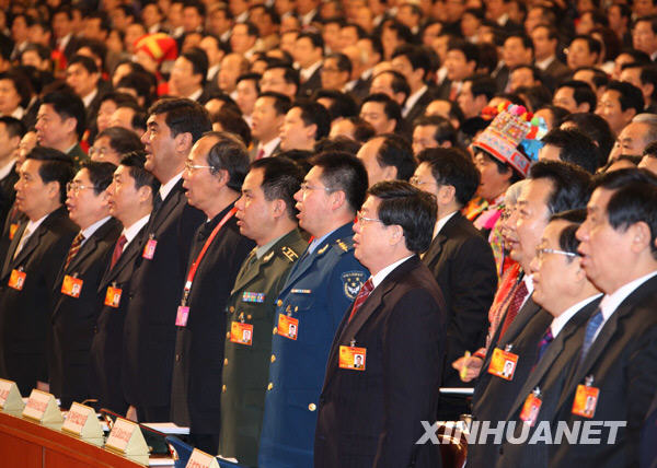 3月5日,第十一届全国人民代表大会第三次会议在北京人民大会堂开幕。这是全国人大代表高唱国歌。新华社记者王建民摄