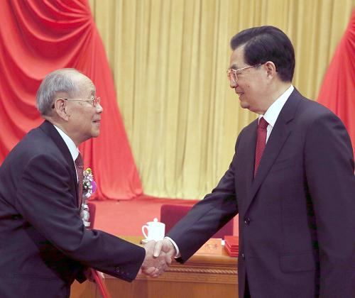 国家主席胡锦涛向获得2012年度国家最高科学技术奖的中国科学院院士、中国工程院院士、中国科学院力学研究所研究员郑哲敏颁发奖励证书