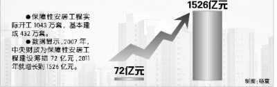 ●数据显示,2007年,中央财政为保障性安居工程建设筹措72亿元,2011年就增长到1526亿元。制图:杨震