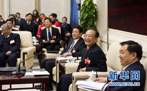3月6日,中共中央政治局常委、国务院总理温家宝参加十一届全国人大五次会议甘肃代表团的审议。 新华社记者 李学仁 摄