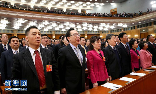 。这是委员们高唱国歌。 新华社记者刘卫兵摄