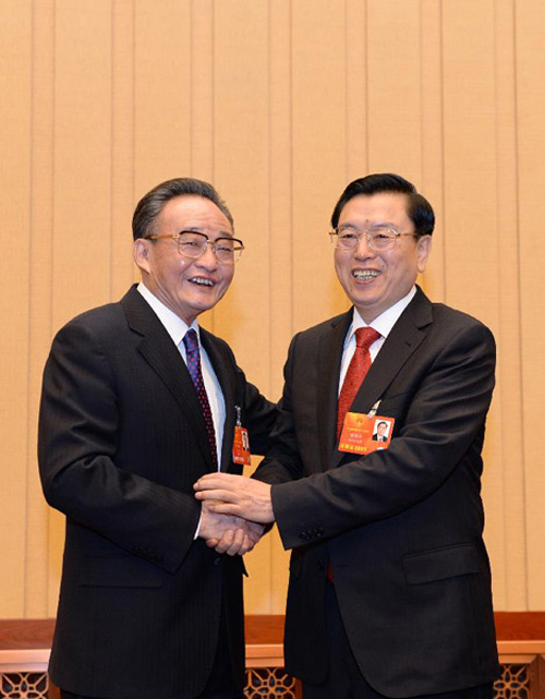 3月4日,十二届全国人大一次会议主席团在北京人民大会堂举行第一次会议。这是吴邦国和张德江握手。 新华社记者 马占成 摄