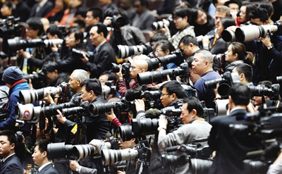 3月15日,十二届全国人大一次会议在北京人民大会堂举行第五次全体会议。图为会议上的摄影记者。周维海摄