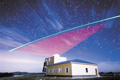 “墨子号”开展量子密钥分发,2017年5月摄于乌鲁木齐南山,多张照片合成了卫星过境全貌。中科院供图