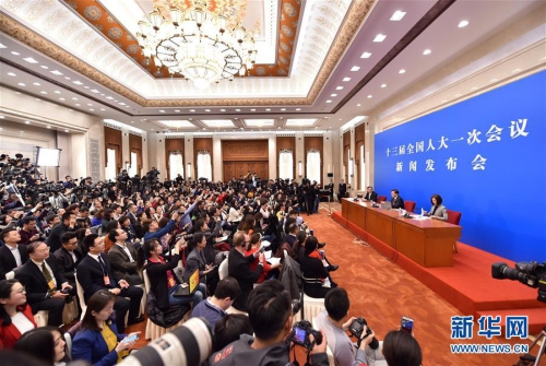 3月4日,十三届全国人大一次会议在北京人民大会堂举行新闻发布会。大会发言人张业遂就大会议程和人大工作相关的问题回答中外记者的提问。新华社记者 李鑫 摄